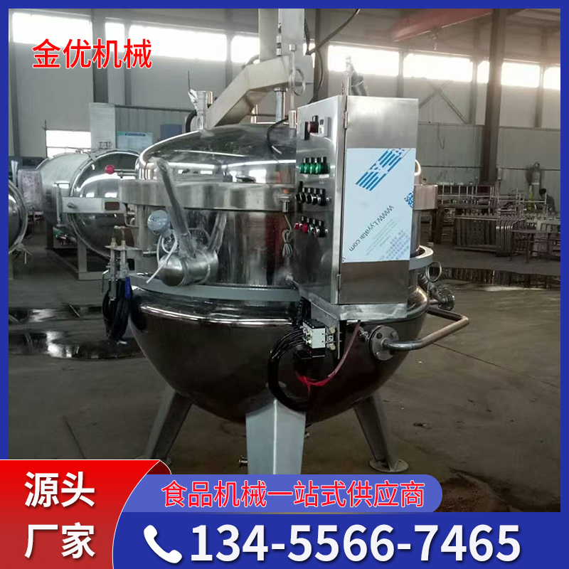 特点:本产品受热面积大、热效率高、加热均匀、物料升温快、加热温度容易控制等特点。金优结合众多食品厂家的专家建议,本锅体搅拌部分采用一次性冲压成型的不锈钢锅体,保证了锅内的平整光滑,剐边采用弹簧式,剐底采用自重式,使锅体与搅拌叶片(搅拌叶片采用高强度的聚乙四氟材料,耐温高达280C°)紧密接触,使物料搅拌均匀,无死角,不粘锅。